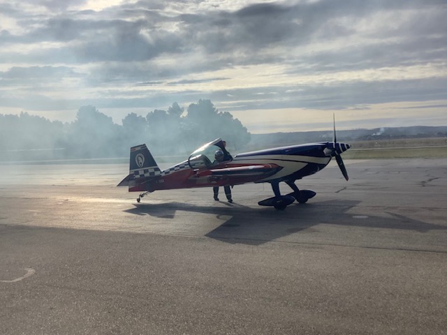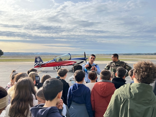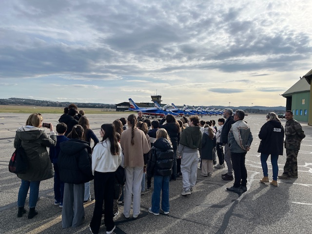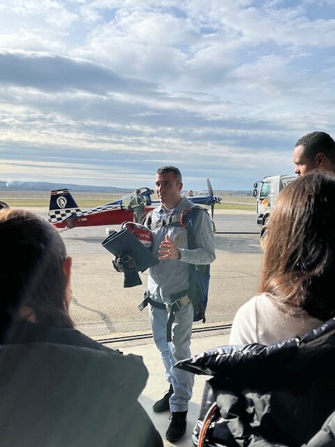 La visite s’est poursuivie par le décollage en direct d’un appareil, suivi d’une démonstration impressionnante de freestyle. Nous avons ensuite participé à une interview très instructive du pilote Florent Oddon, double champion du monde, puis traversé la base pour rejoindre la Patrouille de France.